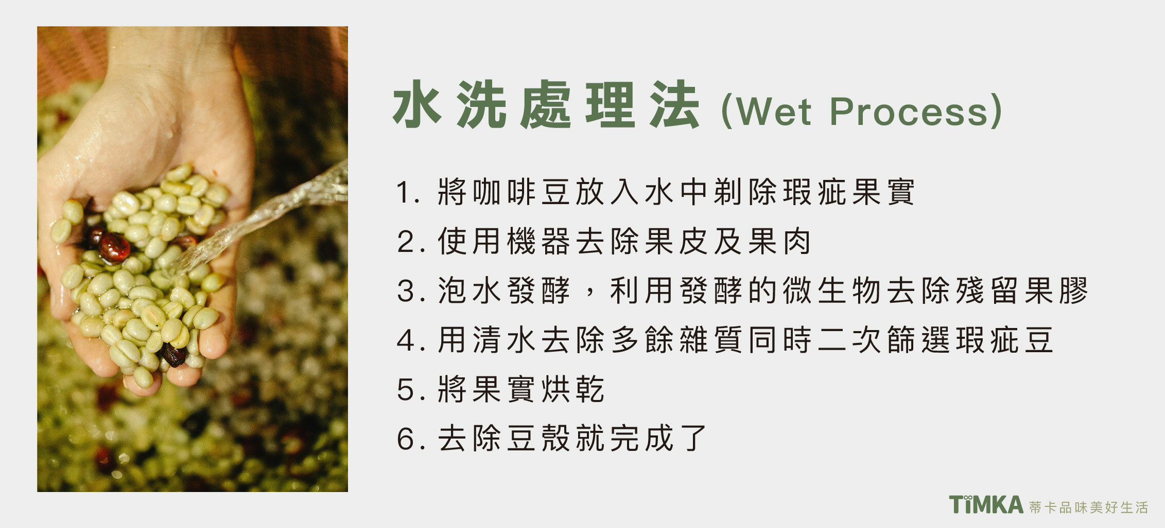 18世紀由荷蘭人所發明的技術,過程繁瑣較適合雨量豐沛的地區。有些地區天氣較為多雨,便需要不一樣的處理方法,先將咖啡豆放入水中剃除瑕疵果實,再使用機器去除果皮及果肉,接著使用發酵方式讓微生物將果膠層吃掉,再放入水中清洗、烘乾,使用去殼機將內果皮去除,便完工了。